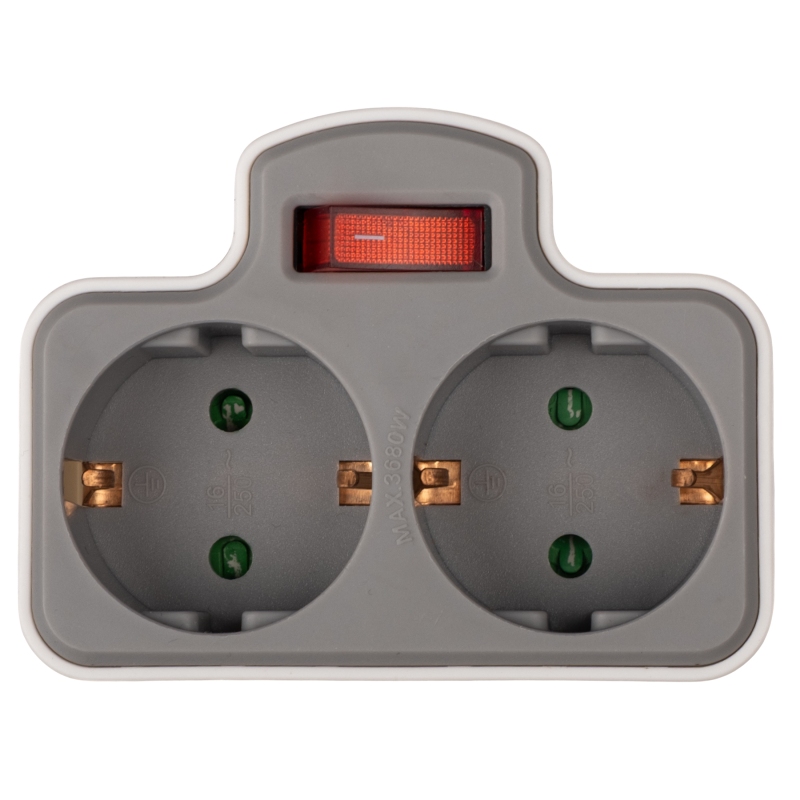 Сетевой бытовой разветвитель с кнопкой. Предназначен для подключения 2-х электрических приборов к одной стационарной розетке. Корпус изготовлен из негорючего ударопрочного пластика.